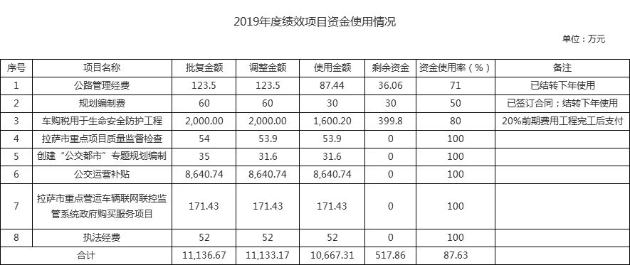 2019年度拉萨市交通运输局机关本级及所属单位纳入预算绩效目标的共8项:规划编制费60万元; 公路管理经费123.5万元; 拉萨市创建“国家公交都市”专题之公交场站专项建设规划35万元; 拉萨市重点项目(西藏S5线拉萨至泽当快速路工程建设项目)质量监督委托抽检费54万元; 公交运营补贴8640.74万元; 车购税统筹用于村道生命安全防护工程2000万元;拉萨市重点营运车辆联网联控监管系统政府购买服务项目171.43万元;执法经费52万元。具体使用明细如下表: