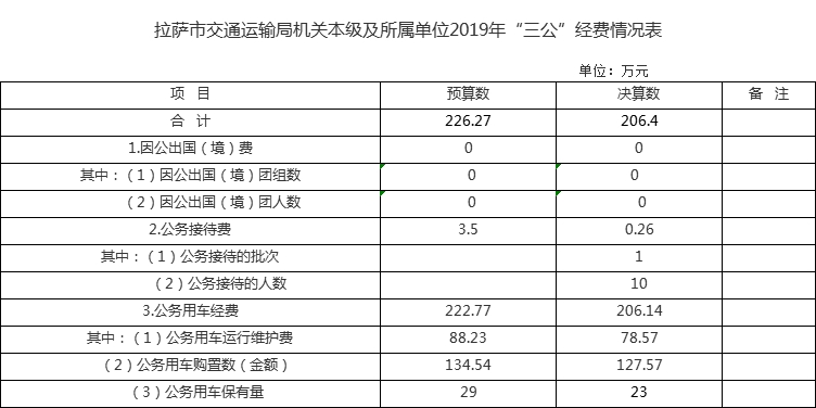 (一)2019年拉萨市交通运输局机关本级及所属单位履行一般行政事业管理职能、维持机关运行,用一般公用预算安排的行政经费合计3,517.4万元。其中,基本支出2,956.91万元,一般行政管理事务项目支出560.49万元。
