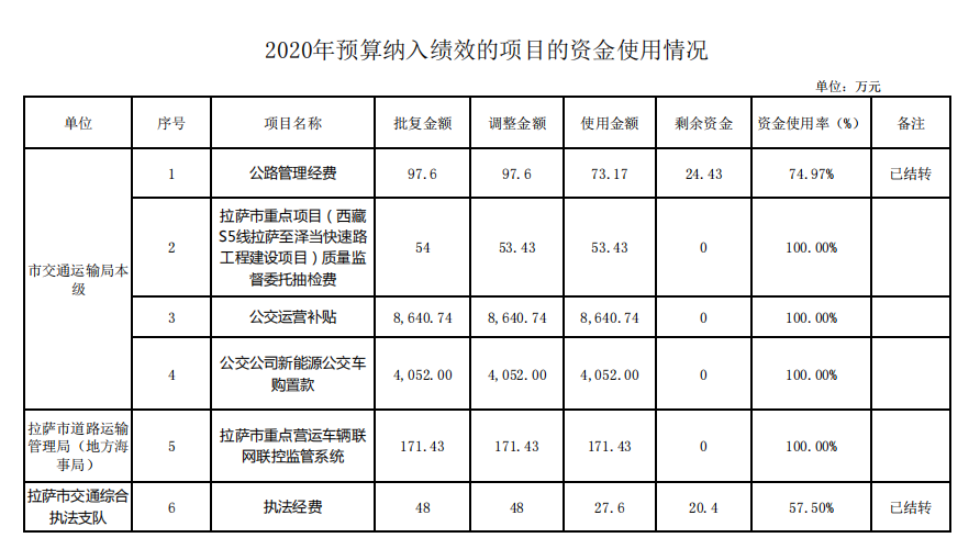 市交通运输局本级2020年预算纳入预算绩效目标的共5项:东环北线建设项目资金20,000.00万元;公路管理经费97.60万元;拉萨市重点项目(西藏S5线拉萨至泽当快速路工程建设项目)质量监督委托抽检费54.00万元;公交运营补贴8,640.74万元;公交公司新能源公交车购置款4,052.00万元;拉萨市道路运输管理局(地方海事局)2020年度纳入预算绩效管理项目为拉萨市重点营运车辆联网联控监管系统,金额为:171.43万元;拉萨市交通综合执法支队2020年度纳入预算绩效管理范畴的项目为执法经费48.00万元,具体如下: